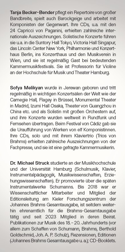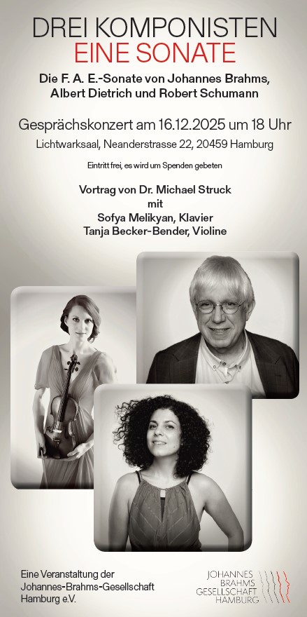 Bereits am 20.12. sind die Altistin Clara Kunzke, die Bratschistin Miryam Veggi und die Pianistin Shoko Kuroe (am Tafelklavier) zu erleben, u.a. mit Brahms´ op. 91 (Zwei Gesänge).